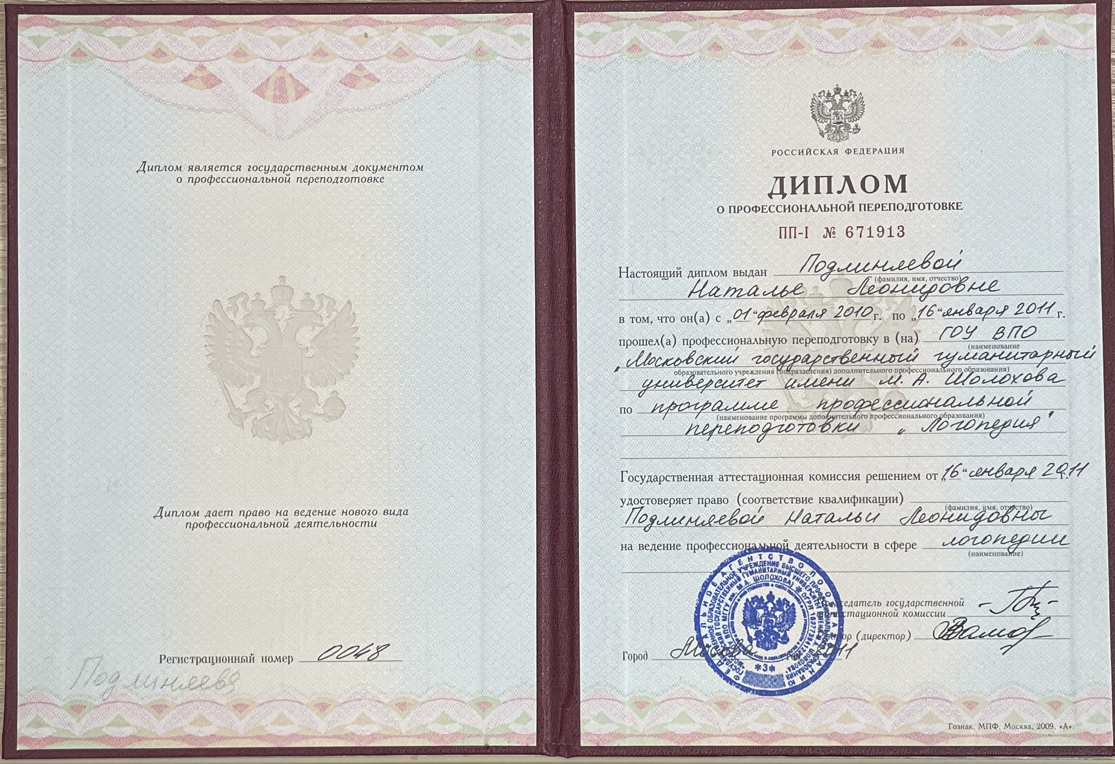 ГОУ ВПО "Московский государственный гуманитарный университет имени М.А. Шолохова", Программа профессиональной переподготовки "Логопедия" (16/01/2011)