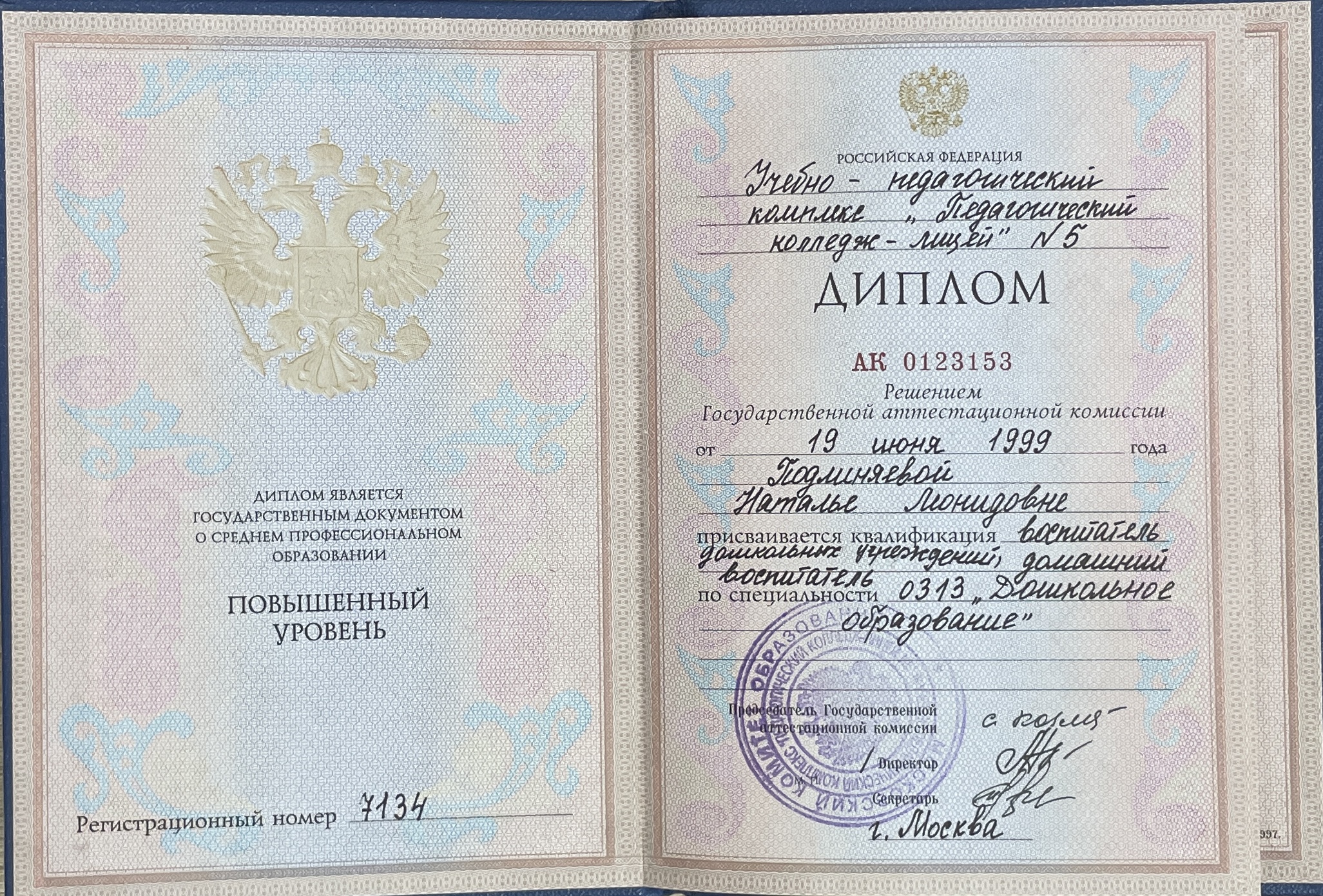 г.Москва, Учебно-педагогический комплекс "Педагогический колледж-лицей "№5, Дошкольное образование.Воспитатель дошкольных учреждений. (19/06/1999)