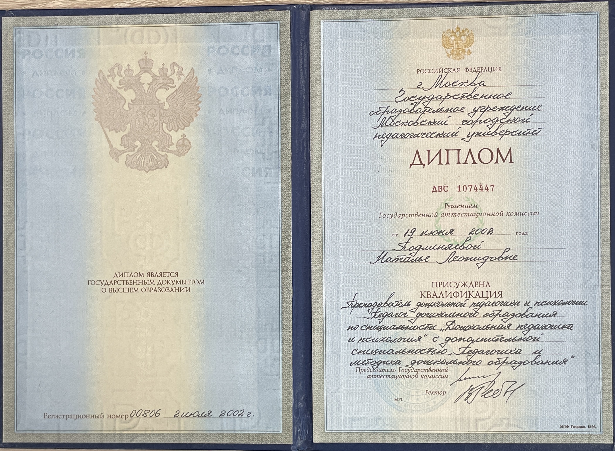 Московский городской педагогический университет, Дошкольная педагогика и психология. Преподаватель дошкольной педагогики и психологии. Педагог дошкольного образования. (19/06/2002)